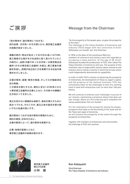 ご挨拶MessagefromtheChairman「民の繁栄が、国の繁栄につながる」初代会頭渋沢栄一のその想いから、東京商工会議所の挑戦が始まりました。激動の時代・明治が始まってまだ日も浅い1878年、商工業者の立場がまだ社会的に低く見られていたこの時代に、当時38歳であった渋沢栄一は東京商法会議所(のちの東京商工会議所)を創立。商工業者の輿論を形成し、民間が自立的に力を発揮できる社会の実現をめざしました。企業の繁栄、首都・東京の発展、そしてわが国経済社会の発展。この使命を果たすため、現在に至る140年余にわたり東京商工会議所は企業とともに、その時々の課題に立ち向かってきました。変化を恐れない積極的な姿勢で、使命を果たすために挑みつづける。それこそが、創立以来の意志を受け継いできた私達の想いです。国の繁栄につながる民の繁栄の実現のために。明日の東京、日本のために。企業の繁栄によって、国の繁栄を実現する。企業・地域の皆様とともに東京商工会議所の挑戦は続きます。“Astheprosperityofthepeoplegoes,sogoestheprosperityofthestate.”ThechallengeofTheTokyoChamberofCommerceandIndustry(TCCI)beganwiththissentimentofEiichiShibusawa,ourfounderand1stChairman.In1878,whenthetumultuousMeijierahadjustgottenunderway,membersofcommerceandindustrywerestillconsideredtobeinalowlyposition.EiichiShibusawa,whowas38yearsoldatthetime,foundedthepredecessorofTCCI,whichwascalledTheTokyoChamberofCommerceandLaw.Theaimofthisinstitutionwastoshapeapublicopiniononmembersofcommerceandindustryandrealizeasocietyinwhichmembersoftheprivatesectorcouldindependentlymanifesttheircapability.InordertofulfillTCCI’smissionoftheprosperityofenterprisesandtheforwarddevelopmentofJapan’scapitalofTokyoandofthenation’seconomy,TCCIhastakenonthechallengesthatpresentedthemselvesoverits140-plusyearhistorytogetherwithenterprises.Wewillcontinuetotakeonsuchchallengesforthesakeoffulfillingourmissionwithaproactivestancethatdoesnotfearchange.That,morethananythingelse,isthesentimentthathasdriventhepassingdownofourfounder’sspiritovertime.ForthesakeofrealizingtheprosperityofthepeoplethatleadstostateprosperityandforthesakeoftheTokyoandJapanoftomorrow,wewillachievetheprosperityofthestatethroughtheprosperityofenterprises.Togetherwithmembersofenterprisesandcommunities,thechallengeofTCCIwillcontinue.東京商工会議所第22代会頭小林健KenKobayashi22ndChairmanTheTokyoChamberofCommerceandIndustry1TheTokyoChamberofCommerceandIndustry