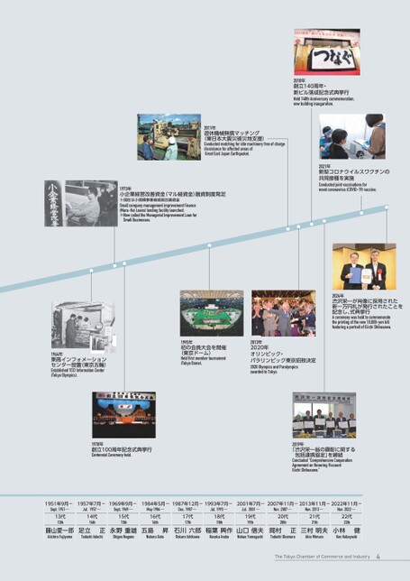 2018年創立140周年・新ビル落成記念式典挙行Held140thAnniversarycommemoration,newbuildinginauguration.2021年新型コロナウイルスワクチンの共同接種を実施Conductedjointvaccinationsfornovelcoronavirus(COVID-19)vaccine.2011年遊休機械無償マッチング(東日本大震災被災地支援)Conductedmatchingforidlemachineryfreeofcharge(AssistanceforaffectedareasofGreatEastJapanEarthquake).1973年小企業経営改善資金(マル経資金)融資制度発足※現在は小規模事業者経営改善資金Smallcompanymanagementimprovementfinance(Maru-KeiLoans)lendingfacilitylaunched.※NowcalledtheManagerialImprovementLoanforSmallBusinesses.1964年東商インフォメーションセンター設置(東京五輪)EstablishedTCCIInformationCenter(TokyoOlympics).1995年初の会員大会を開催(東京ドーム)Heldfirstmembertournament(TokyoDome).2013年2020年オリンピック・パラリンピック東京招致決定2020OlympicsandParalympicsawardedtoTokyo.1978年創立100周年記念式典挙行CentennialCeremonyheld.2019年「渋沢栄一翁の顕彰に関する包括連携協定」を締結Concluded“ComprehensiveCooperationAgreementonHonoringViscountEiichiShibusawa.”1951年9月-Sept.1951-1957年7月-Jul.1957-1969年9月-Sept.1969-1984年5月-May1984-1987年12月-Dec.1987-1993年7月-Jul.1993-2001年7月-Jul.2001-2007年11月-Nov.2007-2013年11月-Nov.2013-2022年11月-Nov.2022-13代13th14代14th15代15th16代16th17代17th18代18th19代19th20代20th21代21th22代22th藤山愛一郎AiichiroFujiyama足立正TadashiAdachi永野重雄ShigeoNagano五島昇NoboruGoto石川六郎RokuroIshikawa稲葉興作KosakuInaba山口信夫NobuoYamaguchi岡村正TadashiOkamura三村明夫AkioMimura小林健KenKobayashiTheTokyoChamberofCommerceandIndustry4