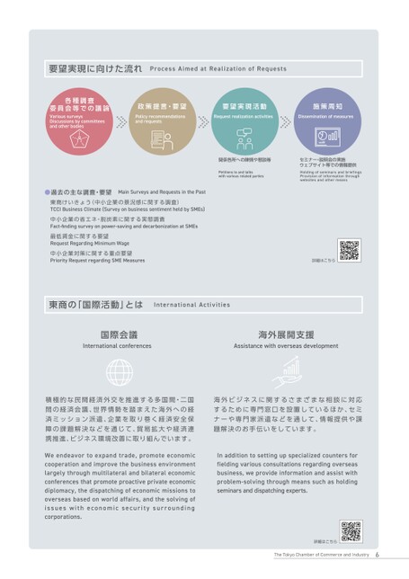 要望実現に向けた流れProcessAimedatRealizationofRequests各種調査委員会等での議論VarioussurveysDiscussionsbycommitteesandotherbodies政策提言・要望Policyrecommendationsandrequests要望実現活動施策周知RequestrealizationactivitiesDisseminationofmeasures関係各所への陳情や懇談等PetitionstoandtalkswithvariousrelatedpartiesMainSurveysandRequestsinthePast●過去の主な調査・要望東商けいきょう(中小企業の景況感に関する調査)TCCIBusinessClimate(SurveyonbusinesssentimentheldbySMEs)会員企業の防災対策に関するアンケートDisasterPreparednessQuestionnaireforMemberCompanies最低賃金に関する要望RequestRegardingMinimumWage東京の観光復活に向けた産業・地域振興に関する重点要望PriorityRequestRegardingPromotionofIndustrialandCommunityDevelopmentAimedatRecoveryofSightseeinginTokyoセミナー・説明会の実施ウェブサイト等での情報提供HoldingofseminarsandbriefingsProvisionofinformationthroughwebsitesandothermeans詳細はこちら東商の「国際活動」とはInternationalActivities国際会議Internationalconferences海外展開支援Assistancewithoverseasdevelopment貿易の拡大や経済連携の推進、ビジネス環境の改善のため、多国間・二国間の国際経済会議を開催し、情報交換や意見交換を行うなど積極的な民間経済外交を推進しています。海外ビジネスに関するさまざまな相談に対応するために専門窓口を設置しているほか、セミナーや専門家派遣などを通して、情報提供や課題解決のお手伝いをしています。Inordertopromoteeconomiccooperationandtheexpansionoftradeandimproveourbusinessenvironment,weholdmultilateralandbilateralinternationaleconomicconferencesandpromoteproactivediplomacyintheprivateeconomythatincludesexchangesofinformationandopinions.Inadditiontosettingupspecializedcountersforfieldingvariousconsultationsregardingoverseasbusiness,weprovideinformationandassistwithproblem-solvingthroughmeanssuchasholdingseminarsanddispatchingexperts.詳細はこちらTheTokyoChamberofCommerceandIndustry6