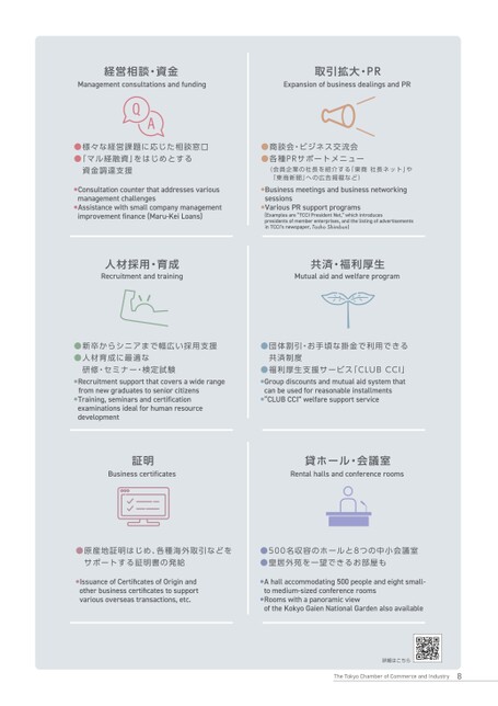 経営相談・資金Managementconsultationsandfunding取引拡大・PRExpansionofbusinessdealingsandPR●様々な経営課題に応じた相談窓口●「マル経融資」をはじめとする資金調達支援●Consultationcounterthataddressesvariousmanagementchallenges●Assistancewithsmallcompanymanagementimprovementfinance(Maru-KeiLoans)●商談会・ビジネス交流会●各種PRサポートメニュー(会員企業の社長を紹介する「東商社長ネット」や「東商新聞」への広告掲載など)●Businesstalksessionsandbusinessnetworkingsessions●VariousPRsupportprograms(Examplesare“TCCIPresidentNet,”whichintroducespresidentsofmemberenterprises,andthelistingofadvertisementsinTCCI’snewspaper,ToshoShimbun)人材採用・育成Recruitmentandtraining共済・福利厚生Mutualaidandwelfareprogram●新卒からキャリアまで幅広い採用支援●人材育成に最適な研修・セミナー・検定試験●Recruitmentsupportthatcoverswiderangefromnewgraduatestomid-careeremployees●Training,seminarsandcertificationexaminationsidealforhumanresourcedevelopment●団体割引・お手頃な掛金で利用できる共済制度●福利厚生支援サービス「CLUBCCI」●Groupdiscountsandmutualaidsystemthatcanbeusedforreasonableinstallments●“CLUBCCI”welfaresupportservice証明Businesscertificates貸ホール・会議室Rentalhallsandconferencerooms●原産地証明・貿易業務に関する証明書の発給●IssuanceofCertificatesofOriginandcertificatesregardingtradeoperations●東京駅近くで好立地。全室スクリーン等完備のホール、中小会議室を貸出し●Hallsandsmall-tomedium-sizedconferenceallfullyequippedwithscreensandotherequipmentareofferedforrentinideallocationsincloseproximitytoTokyoStation詳細はこちらTheTokyoChamberofCommerceandIndustry8