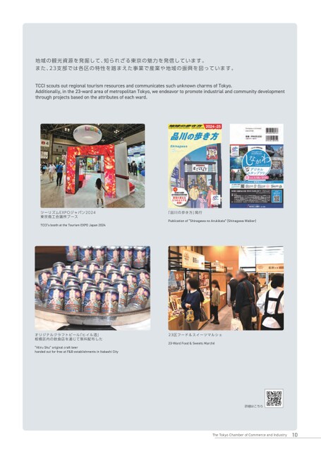 地域の観光資源を発掘して、知られざる東京の魅力を発信しています。また、23支部では各区の特性を踏まえた事業で産業や地域の振興を図っています。TCCIscoutsoutregionaltourismresourcesandcommunicatessuchunknowncharmsofTokyo.Additionally,inthe23-wardareaofmetropolitanTokyo,weendeavortopromoteindustrialandcommunitydevelopmentthroughprojectsbasedontheattributesofeachward.ツーリズムEXPOジャパン2022東京商工会議所ブースTCCI’sboothattheTourismEXPOJapan2022たいとうデジタルスタンプラリーTaitoDigitalStampRallyKATSUSHIKA町工場百貨市KATSUSHIKAFactoryFair渋沢栄一のおもてなし〜王子飛鳥山の茶室無心庵から〜HospitalitybyEiichiShibusawa:FromMushin’an,theTeaHouseatOjiAsukayama詳細はこちらTheTokyoChamberofCommerceandIndustry10