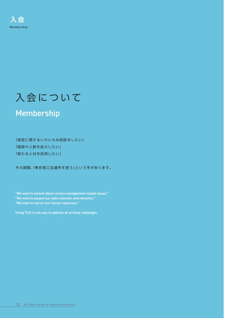 入会Membership入会についてMembership「経営に関するいろいろな相談をしたい」「販路や人脈を拡大したい」「新たな人材を採用したい」その課題、「東京商工会議所を使う」という手があります。“Wewanttoconsultaboutvariousmanagement-relatedissues.”“Wewanttoexpandoursaleschannelsandnetworks.”“Wewanttorecruitnewhumanresources.”UsingTCCIisonewaytoaddressallofthosechallenges.13TheTokyoChamberofCommerceandIndustry