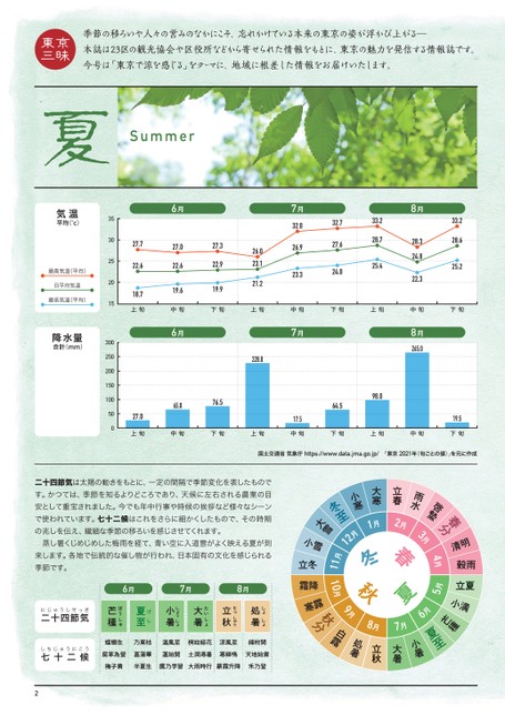 夏Summer6月7月8月気温平均(c)降水量合計(mm)二十四節気にじゅうしせっき七十二候しちじゅうにこう種ぼうしゅ夏至げし小暑しょうしょ大暑たいしょ処暑しょしょ立秋りっしゅう国土交通省気象庁https://www.data.jma.go.jp/「東京2021年(旬ごとの値)」を元に作成二十四節気は太陽の動きをもとに、一定の間隔で季節変化を表したものです。かつては、季節を知るよりどころであり、天候に左右される農業の目安として重宝されました。今でも年中行事や時候の挨拶など様々なシーンで使われています。七十二候はこれをさらに細かくしたもので、その時期の兆しを伝え、繊細な季節の移ろいを感じさせてくれます。蒸し暑くじめじめした梅雨を経て、青い空に入道雲がよく映える夏が到来します。各地で伝統的な催し物が行われ、日本固有の文化を感じられる季節です。蟷螂生腐草為螢梅子黄乃東枯菖蒲華半夏生温風至蓮始開鷹乃学習桐始結花土潤溽暑大雨時行涼風至寒蝉鳴蒙霧升降綿柎開天地始粛禾乃登6月7月8月6月7月8月1月12月11月10月9月8月7月6月5月4月3月2月立春大暑立秋処暑小暑大寒小寒雨水啓蟄冬至春分大雪清明小雪穀雨立冬立夏小満霜降寒露種秋分白露夏至冬春秋夏上旬中旬下旬上旬中旬下旬上旬中旬下旬上旬中旬下旬上旬中旬下旬上旬中旬下旬最高気温(平均)日平均気温最低気温(平均)353025201530025020015010050076.564.598.065.0228.017.5265.019.527.027.733.228.332.732.026.027.333.227.022.622.622.923.126.927.628.724.828.618.719.619.921.223.324.025.422.325.2季節の移ろいや人々の営みのなかにこそ、忘れかけている本来の東京の姿が浮かび上がる―本誌は23区の観光協会や区役所などから寄せられた情報をもとに、東京の魅力を発信する情報誌です。今号は「東京で涼を感じる」をテーマに、地域に根差した情報をお届けいたします。東京三昧2