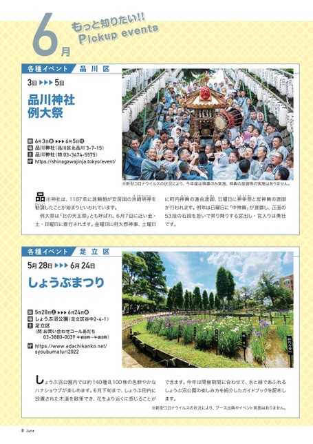 もっと知りたい!!Pickupevents6月■■■■■■■■品川神社例大祭3日▶▶▶5日5月28日▶▶▶6月24日しょうぶ沼公園(足立区谷中2-4-1)足立区(問:お問い合わせコールあだち03-3880-0039午前8時〜午後8時)https://www.adachikanko.net/syoubumaturi20225月28日▶▶▶6月24日期場主HP品川区足立区しょうぶまつり川神社は、1187年に源頼朝が安房国の洲崎明神を勧請したことが始まりといわれています。例大祭は「北の天王祭」とも呼ばれ、6月7日に近い金・土・日曜日に斎行されます。金曜日に例大祭神事、土曜日品ょうぶ沼公園内では約140種8,100株の色鮮やかなハナショウブが楽しめます。6月下旬まで、しょうぶ田内に設置された木道を散策でき、花をより近くに感じることがし各種イベント各種イベント6月3日▶▶▶6月5日品川神社(品川区北品川3-7-15)品川神社(問:03-3474-5575)https://shinagawajinja.tokyo/event/期場主HP※新型コロナウイルスの状況により、ブース出典やイベント実施はありません。※新型コロナウイルスの状況により、今年度は神事のみ実施、神輿の渡御等の実施はありません。に町内神輿の連合渡御、日曜日に神幸祭と宮神輿の渡御が行われます。例年は日曜日に「中神輿」が渡御し、正面の53段の石段を担いで昇り降りする宮出し・宮入りは勇壮です。できます。今年は開催期間に合わせて、水と緑であふれるしょうぶ沼公園の楽しみ方を紹介したガイドブックを配布します。かんじょうすさきみょうじんみこしとぎょしんこうさいJune8