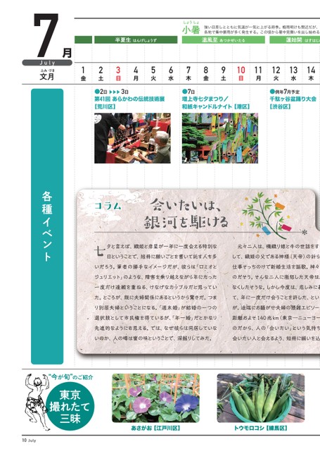 あさがお【江戸川区】トウモロコシ【練馬区】●7日増上寺七夕まつり/和紙キャンドルナイト【港区】●例年7月予定千駄ヶ谷盆踊り大会【渋谷区】●2日▶▶▶3日第41回あらかわの伝統技術展【荒川区】東京撮れたて三昧“今が旬”のご紹介各種イベント7月Julyふみづき文月1234567891011121314日月火水木金金土日月火水木温風至あつかぜいたる蓮始開はすはじめ強い日差しとともに気温が一気に上がる時季。梅雨明けも間近だが、各地で集中豪雨が多く発生する。この頃から暑中見舞いを出し始める。しょうしょ小暑土半夏生はんげしょうず夕と言えば、織姫と彦星が一年に一度会える特別な日ということで、短冊に願いごとを書いて託す人も多いだろう。筆者の勝手なイメージだが、彼らは「ロミオとジュリエット」のような、障害を乗り越えながら年にたった一度だけ逢瀬を重ねる、けなげなカップルだと思っていた。ところが、既に夫婦関係にあるというから驚きだ。つまり別居夫婦ということになる。「週末婚」が結婚の一つの選択肢として市民権を得ているが、「年一婚」だとかなり先進的なようにも思える。では、なぜ彼らは同居していないのか、人の噂は蜜の味ということで、深掘りしてみた。七コラム元々二人は、機織り娘と牛の世話をするして、織姫の父である神様(天帝)の計らい仕事そっちのけで新婚生活を謳歌。神々ののだそう。そんな二人に激怒した天帝は、なくしたそうな。しかし今度は、悲しみに暮て、年に一度だけ会うことを許した、というが、途端にお騒がせ夫婦の猥雑エピソード距離およそ140兆km(東京―ニューヨーのだから、人の「会いたい」という気持ち会いたい人と会えるよう、短冊に願いを込会いたいは、銀河を駆けるJuly10