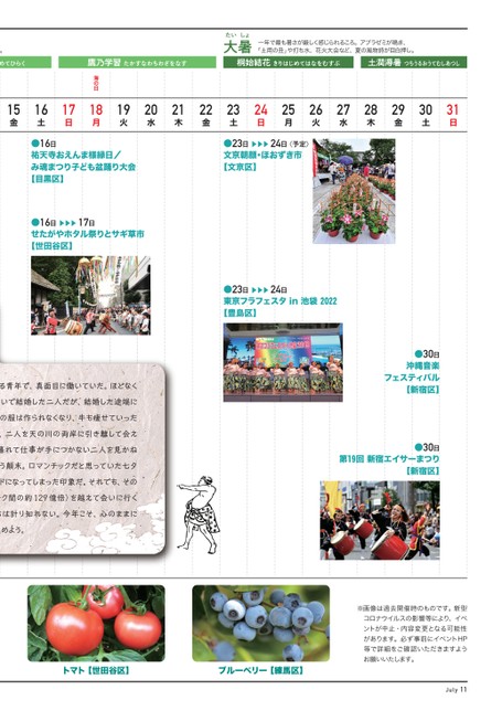 ブルーベリー【練馬区】トマト【世田谷区】●16日祐天寺おえんま様縁日/み魂まつり子ども盆踊り大会【目黒区】●16日▶▶▶17日せたがやホタル祭りとサギ草市【世田谷区】●23日▶▶▶24日東京フラフェスタin池袋2022【豊島区】●30日第19回新宿エイサーまつり【新宿区】●30日沖縄音楽フェスティバル【新宿区】●23日▶▶▶24日〈予定〉文京朝顔・ほおずき市【文京区】※画像は過去開催時のものです。新型コロナウイルスの影響等により、イベントが中止・内容変更となる可能性があります。必ず事前にイベントHP等で詳細をご確認いただきますようお願いいたします。15161718192021222324252627282930金土日月火水木金土日土31日月火水木金めてひらく土潤溽暑つちうるおうてむしあつし鷹乃学習たかすなわちわざをなす桐始結花きりはじめてはなをむすぶ、る。一年で最も暑さが厳しく感じられるころ。アブラゼミが鳴き、「土用の丑」や打ち水、花火大会など、夏の風物詩が目白押し。たいしょ大暑海の日る青年で、真面目に働いていた。ほどなくらいで結婚した二人だが、結婚した途端に々の服は作られなくなり、牛も痩せていった、二人を天の川の両岸に引き離して会え暮れて仕事が手につかない二人を見かねう顛末。ロマンチックだと思っていた七夕ードになってしまった印象だ。それでも、そのーク間の約129億倍)を越えて会いに行くちは計り知れない。今年こそ、心のままに込めよう。July11