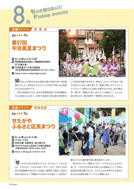 8月■■■■■■■■■6日▶▶▶7日第57回中目黒夏まつり8月6日▶▶▶8月7日目黒銀座商店街通り、西銀座商店街通り、GT交通広場中目黒夏まつり実行委員会(問:目黒銀座商店街協同組合03-3712-2944)https://www.e-nakameguro,com/期場主HP8月6日▶▶▶8月7日11:00~19:00若林公園、松陰神社、国士舘大学せたがやふるさと区民まつり実行委員会(共催:世田谷区)問:03-6304-3593)https://setagaya-matsuri.comせたがやふるさと区民まつり6日▶▶▶7日世田谷区年以上の歴史がある目黒の夏の恒例行事「中目黒夏まつり」は、阿波おどりとよさこいの両方が楽しめる目黒ならではのお祭りです。初日の阿波おどりは、地元の目黒銀座連、区役所職員のさんま連などに加えて、各地で活躍する有名連も多数参加目黒区期時場主HPもっと知りたい!!Pickupeventsたがやふるさと区民まつり」は、“みつけよう心のふるさとひろげよう心のふれあい”をテーマに、今年で43回目の会場開催を迎えます。企画から運営まで幅広い区民の参加と協力によって開催される本まつりを通して、世田谷にせ各種イベント各種イベント50して商店街を練り歩きます。翌日は、よさこいが行われ、鳴子の音が心地よく鳴り響く中、優雅な舞いやダイナミックでスピード感あふれる踊りを繰り広げます。地元商店街・踊り手・観客の3者一体となって地域と人、人と人を結ぶ絆となり、夏の目黒が一層熱気に包まれます。暮らす人々の連帯感や郷土愛を高めています。昨年はオンライン開催でしたが、リアルな人と人とのふれあいや、つながりの大切さを感じられる機会として、今年は感染症対策を講じながら、子どもからお年寄りまで誰もが楽しめる企画を用意してリアルで開催します。August16