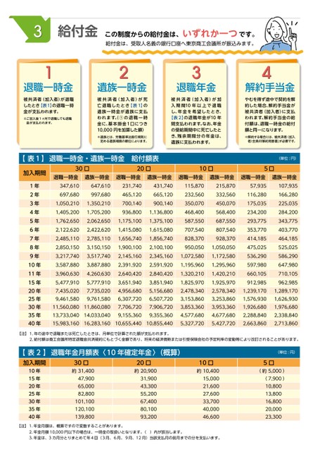 3給付金この制度からの給付金は、いずれか一つです。給付金は、受取人名義の銀行口座へ東京商工会議所が振込みます。1退職一時金被共済者(加入者)が退職したとき【表1】の退職一時金が支払われます。※ご加入後1ヶ月で退職しても退職金が支払われます。2遺族一時金被共済者(加入者)が死亡退職したとき【表1】の遺族一時金が遺族に支払われます。(①の退職一時金に、基本掛金1口につき10,000円を加算した額)※遺族とは、労働基準法施行規則に定める遺族補償の順位によります。3退職年金被共済者(加入者)が加入期間10年以上で退職し、年金を希望したとき、【表2】の退職年金が10年間支払われます。なお、年金の受給期間中に死亡したとき、残余期間分の年金は、遺族に支払われます。【表1】退職一時金・遺族一時金給付額表30口20口10口4解約手当金やむを得ず途中で契約を解約した場合、解約手当金が被共済者(加入者)に支払われます。解約手当金の給付額は、退職一時金の給付額と同一になります。※解約する場合には、被共済者(加入者)全員の「解約同意書」が必要です。(単位:円)5口加入期間1年2年3年4年5年6年7年8年9年10年11年15年20年25年30年35年40年退職一時金遺族一時金退職一時金遺族一時金退職一時金遺族一時金退職一時金遺族一時金347,610697,6801,050,2101,405,2001,762,6502,122,6202,485,1102,850,1503,217,7403,587,8803,960,6305,477,9107,435,0209,461,58011,560,08013,733,04015,983,160647,610997,6801,350,2101,705,2002,062,6502,422,6202,785,1103,150,1503,517,7403,887,8804,260,6305,777,9107,735,0209,761,58011,860,08014,033,04016,283,160231,740465,120700,140936,8001,175,1001,415,0801,656,7401,900,1002,145,1602,391,9202,640,4203,651,9404,956,6806,307,7207,706,7209,155,36010,655,440431,740665,120900,1401,136,8001,375,1001,615,0801,856,7402,100,1002,345,1602,591,9202,840,4203,851,9405,156,6806,507,7207,906,7209,355,36010,855,440115,870232,560350,070468,400587,550707,540828,370950,0501,072,5801,195,9601,320,2101,825,9702,478,3403,153,8603,853,3604,577,6805,327,720215,870332,560450,070568,400687,550807,540928,3701,050,0501,172,5801,295,9601,420,2101,925,9702,578,3403,253,8603,953,3604,677,6805,427,72057,935116,280175,035234,200293,775353,770414,185475,025536,290597,980660,105912,9851,239,1701,576,9301,926,6802,288,8402,663,860107,935166,280225,035284,200343,775403,770464,185525,025586,290647,980710,105962,9851,289,1701,626,9301,976,6802,338,8402,713,860【注】1.年の途中で退職または死亡したときは、月単位で計算された額が支払われます。2.給付額は商工会議所特定退職金共済規約にもとづく金額であり、将来の経済情勢または引受保険会社の予定利率の変動等により改訂されることがあります。【表2】退職年金月額表〈10年確定年金〉(概算)加入期間10年15年20年25年30年35年40年30口約31,40047,90065,00082,800101,100120,100139,80020口約20,90031,90043,30055,20067,40080,10093,20010口約10,40015,00021,60027,60033,70040,00046,600【注】1.年金月額は、概算ですので変動することがあります。2.年金月額10,000円以下の場合は、一時金の取扱いとなります。()内が該当します。3.年金は、3カ月分とりまとめて年4回(3月、6月、9月、12月)当該支払月の前月までの分を支払います。(単位:円)5口(約5,000)(7,900)10,80013,80016,80020,00023,300